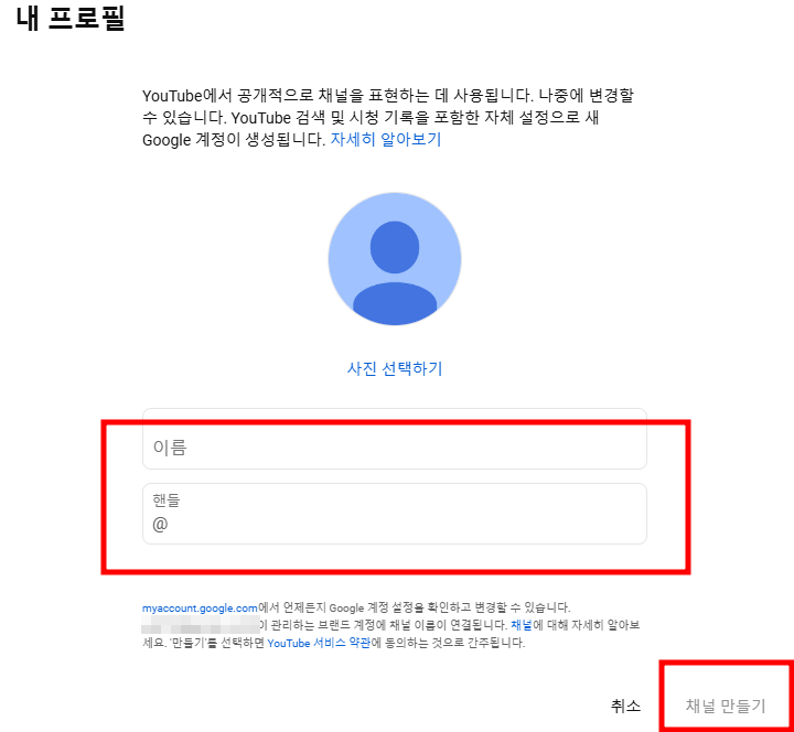 이름과 핸들을 입력하고 채널만들기를 클릭합니다. 나중에 수정 가능합니다.