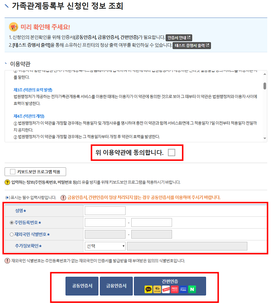이용 약관 동의를 클릭하고 필수 입력사항 기입 후 공동인증서, 금융인증서, 간편 인증(카카오톡, PASS, 네이버)  중 편한 방법을 선택하고 인증합니다.