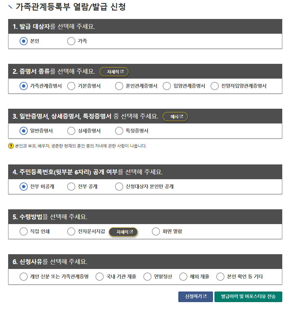 • 특정 증명서: 나에게 필요한 특정 가족 구성원의 정보만 콕 집어 발급받을 수 있습니다.