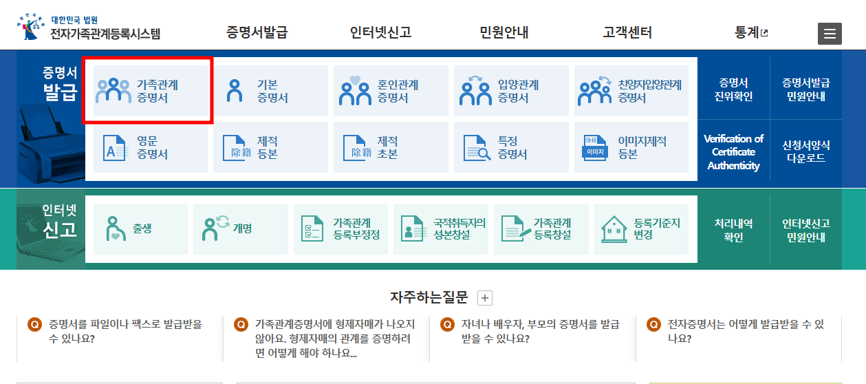 자주 찾는 서비스에서 가족관계증명서를 클릭합니다.