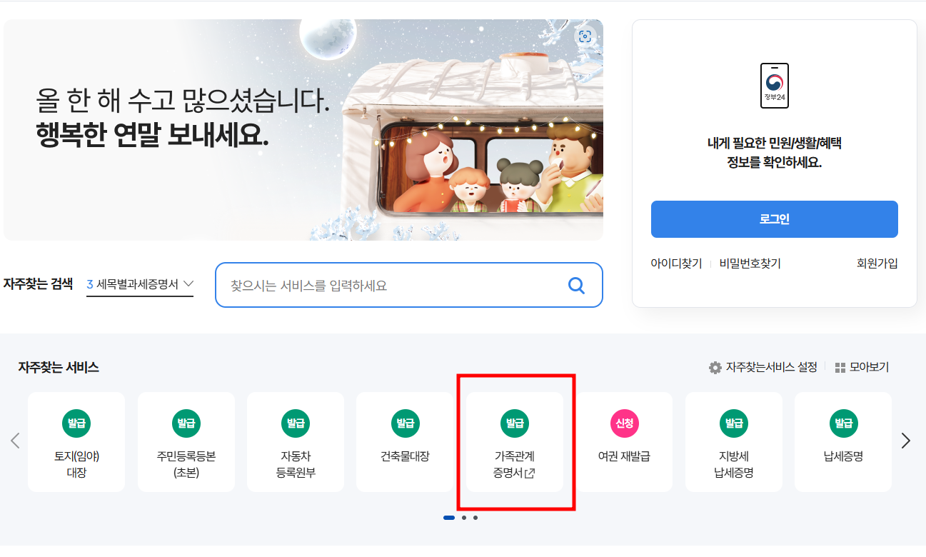 자주 찾는 서비스에서 가족관계증명서를 클릭합니다.