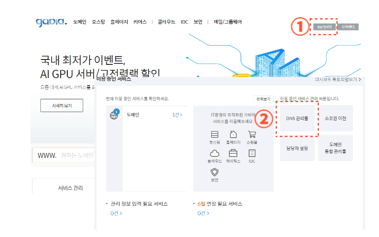 6. [My 가비아] 에 들어가서 [DNS 관리툴]을 누릅니다.