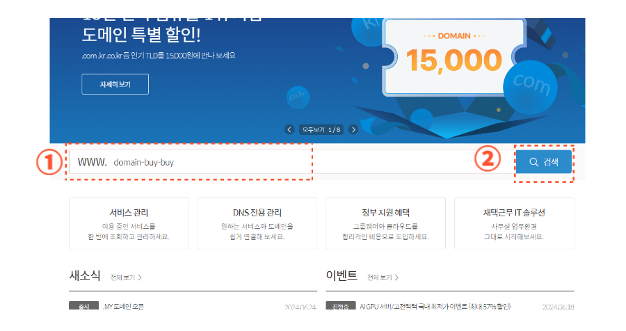 2. 원하는 도메인을 입력 후 [검색]을 누릅니다.
