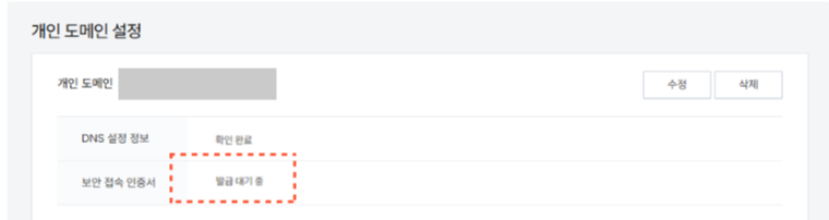 9.도메인 연결이 끝났습니다. 보안 접속 인증서는 몇시간 뒤 확인완료로 변경됩니다.