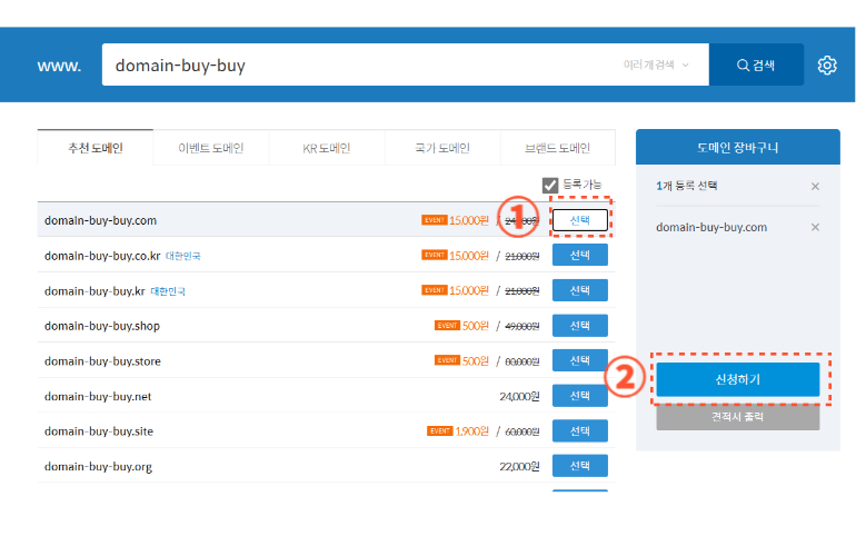 3. 도메인마다 가격이 다르기 때문에 원하는 도메인 선택 후 [신청하기]를 누릅니다.