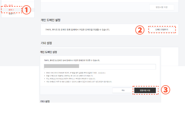 8. [티스토리 관리] - [블로그]를 누르고 [도메인 연결하기]를 누른뒤 구입한 도메인 입력 후 [변경사항 저장]을 누릅니다.
