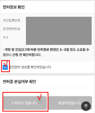 면허정보 확인 후 체크/ 면허증 소지여부 체크