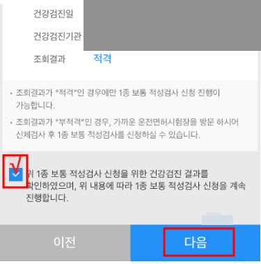 건강검진 자료 조회 후 적격 여부 확인, 체크박스 와 다음 클릭