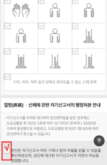 질병 신체에 관한 자기신고서 작성. 맨 아래 거짓이 아님 증명에 체크