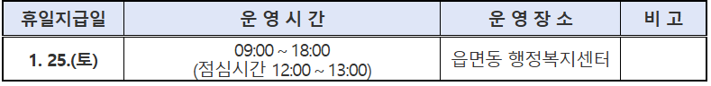 휴일지급일은 1월 25일 토요일 오전 9시 ~ 오후 6시이며 점심시간은 12시~1시까지입니다.