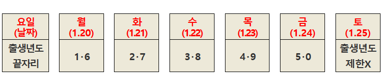 집중신청기간인 1월 20일 월요일 ~ 1월 25일 토요일까지는 5부제 신청이 적용됩니다.